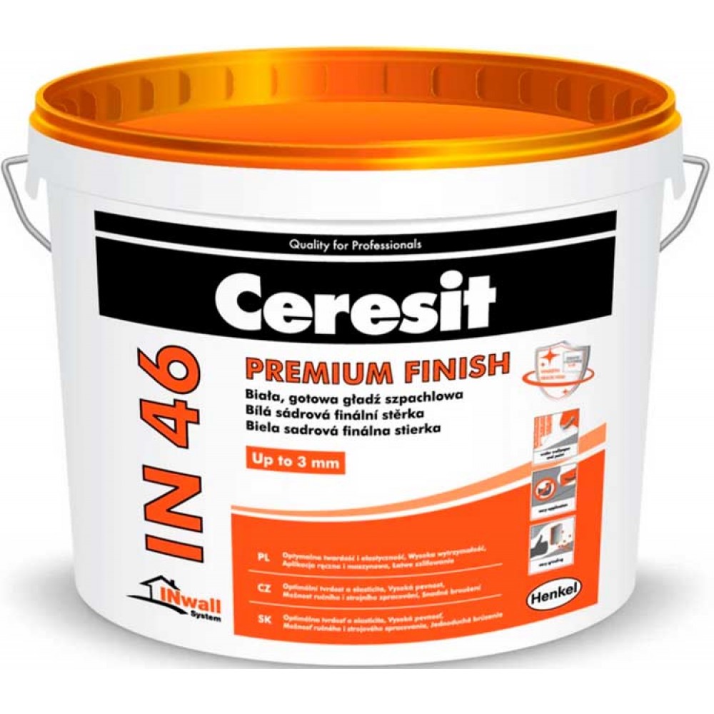 Белая готовая к применению шпатлевка Ceresit IN 46 служит для финишной подготовки стен и потолков под окрашивание или оклейку обоями. Благодаря применению технологии InSure и специальных заполнителей SMART POLYMER шпатлевка позволяет получать эластичное и прочное покрытие. Материал готов к применению. После отвердения легко обрабатывается. Неизрасходованный материал следует хранить в закрытой таре. Шпатлевку не применять на деревянных, металлических, стеклянных и пластмассовых основаниях, а также в помещениях с высокой влажностью. Для заполнения трещин и предварительного выравнивания поверхности следует применять шпатлевку Ceresit IN 35.
