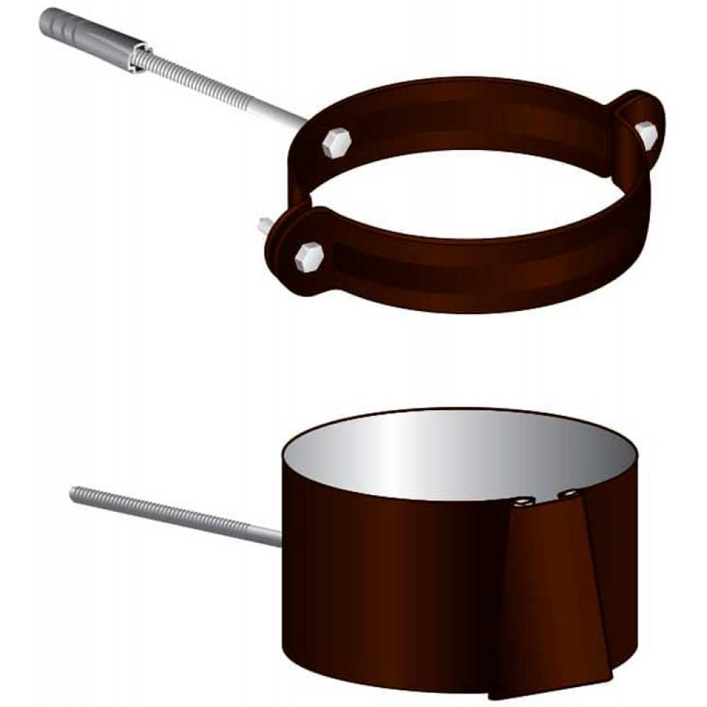 Элемент водосточной системы, который обеспечивает фиксацию водосточной трубы на кирпичных, бетонных или каменных стенах. Изготовлен из оцинкованной стали с полимерным покрытием. Устанавливаются на расстоянии не более 1 м друг от друга, но не менее 2 штук на каждую водосточную трубу. В первую очередь крепятся кронштейнами места стыков труб между собой и коленами.