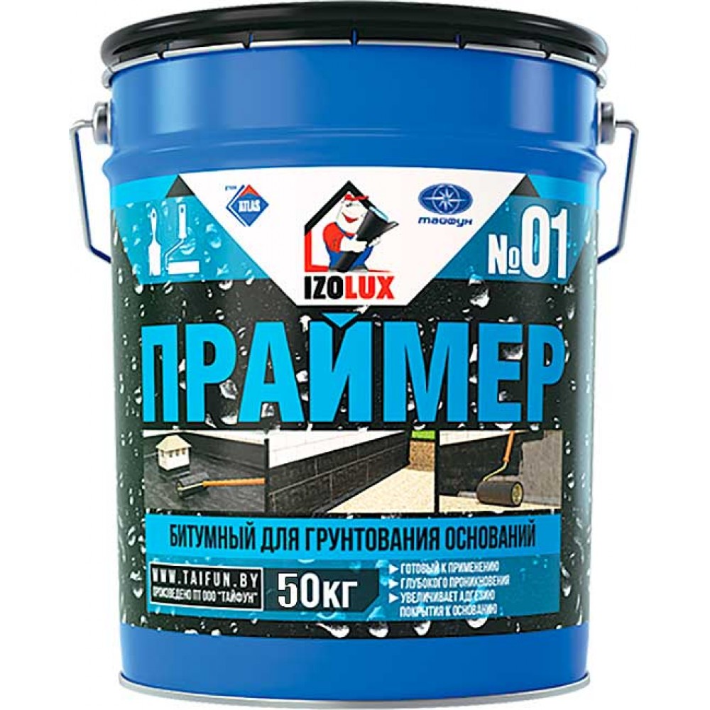 Праймер битумный для грунтования оснований IZOLUX №01 50л применяется для грунтования (пропитки) поверхности цементно-песчаных, бетонных и других минеральных, битумных и деревянных оснований перед укладкой наплавляемых, самоклеющихся и обмазочных кровельных и гидроизоляционных материалов на битумной основе.