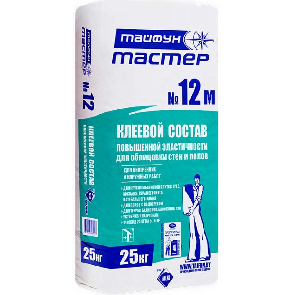Универсальный клей для плитки повышенной эластичности Тайфун Мастер №12М 25кг. предназначен для покрытий, подвергающихся деформациям – благодаря своей эластичности компенсирует напряжения:
