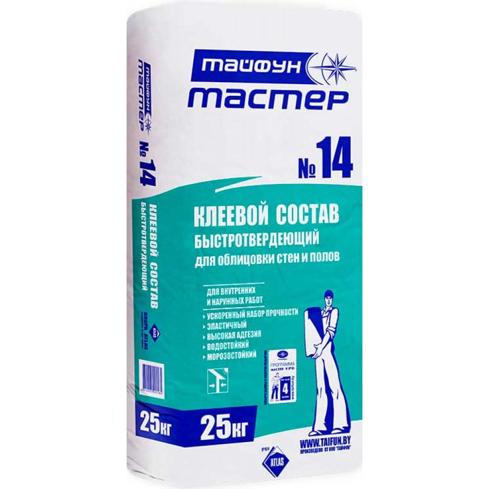 Универсальный клей для плитки быстротвердеющий Тайфун Мастер №14 25кг. производится в виде сухой смеси, состоящей из цементного вяжущего, заполнителя и специально подобранных модифицирующих добавок высокого качества. Клей для плитки быстротвердеющий Тайфун Мастер №14 25кг. имеет оптимально подобранную рецептуру, которая обеспечивает: короткое время схватывания – легкая эксплуатация и затирка швов возможны не ранее чем через 4 часа от момента завершения процесса облицовки; отсутствие сползания позволяет производить приклеивание плитки «сверху вниз» – согласно рекомендациям оптимальный подбор консистенции и толщины слоя исключают сползание клея, что позволяет начинать работу от верхней части стены и избегать приклеивания отрезанных плиток в хорошо просматриваемых местах.