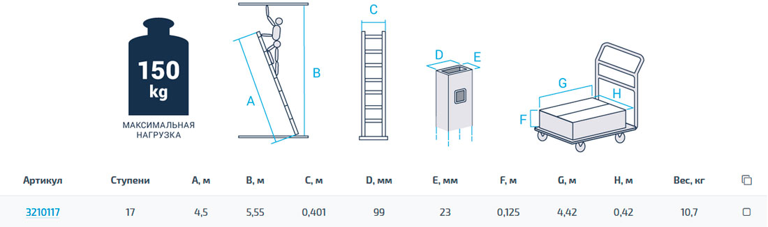 - Опорные наконечники из двухкомпонентного пластика (жёсткий компонент отвечает за надёжность крепления, мягкий препятствует скольжению лестницы)
