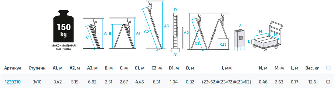 - Верхняя секция легко снимается и устанавливается и может использоваться как отдельная приставная лестница
