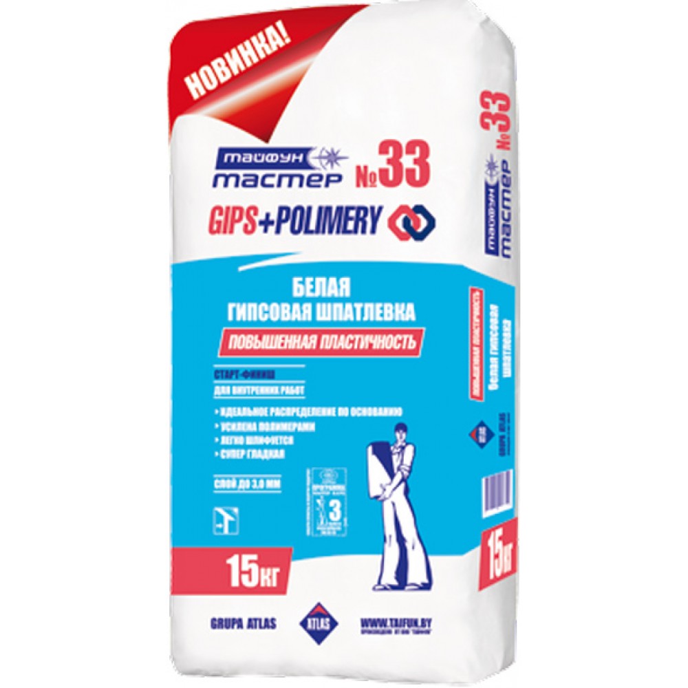 Шпатлёвка «Тайфун Мастер» №33 применяется для окончательного выравнивания поверхностей внутри помещений выполненных из гипсокартонных (ГКП) и гипсоволокнистых (ГВП) плит, а также гипсовых, известково-цементных, цементных штукатурок и бетона. Состав может применяться для заделки выбоин, сколов на поверхности, для заполнения швов в стыках ГКП и ГВП. Средний расход: мешок 15 кг - 15 м. кв. в один слой.