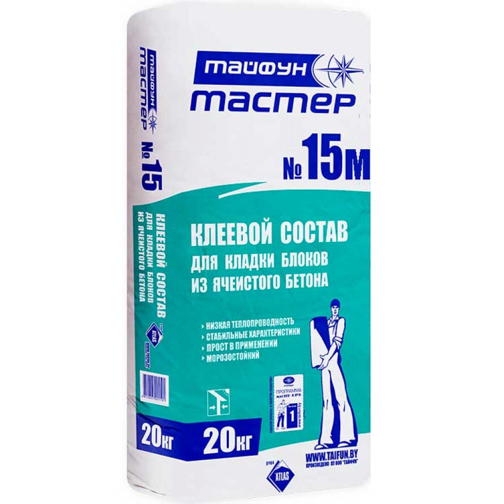 Клей для блоков из ячеистого бетона Тайфун Мастер №15М 20кг. применяется для кладки стен и перегородок из газосиликатных, пенобетонных, керамзитобетонных блоков и других штучных стеновых материалов, имеющих высокое водопоглощение. В состав входит перлитовый заполнитель, что уменьшает тепловые потери через кладочный шов. Также применяется для заполнения выбоин, сколов и трещин в кладке.