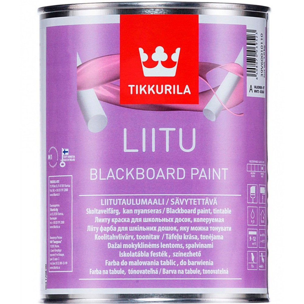 Краска для школьных досок Liitu Tikkurila 0,9л. предназначена для окраски мебели, дверей, барных досок и стен внутри помещений. Это практичное лакокрасочное покрытие позволит писать цветным и белым мелом на поверхности и в последующем легко его стереть, не оставив ни следа.