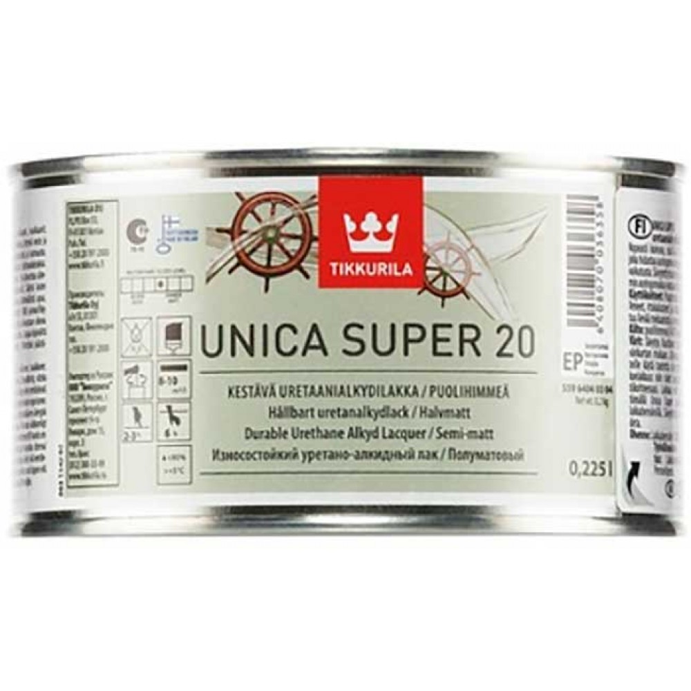 Универсальный полуматовый лак Tikkurila Unica Super 20 0,225л. предназначен для защиты деревянных поверхностей внутри и снаружи помещений. Лак разработан на уретано-алкидной основе, благодаря чему он быстро высыхает и экономит время при лакировке. Это является большим преимуществом при работе с переменными погодными условиями.