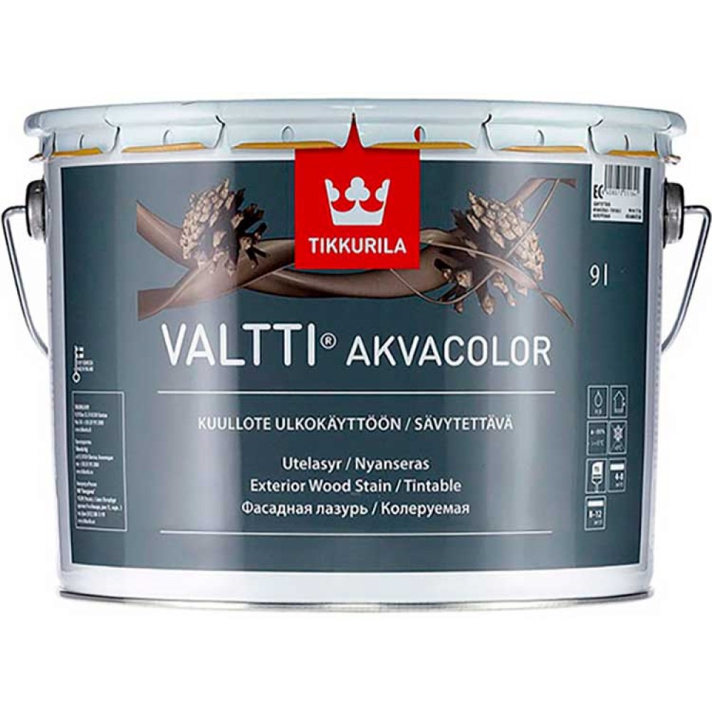Фасадная лазурь Valtti Akvacolor Tikkurila 9л. предназначена для защиты пиленых, бревенчатых и строганых деревянных поверхностей, в том числе для окраски термообработанной и пропитанной под давлением древесины снаружи помещений.