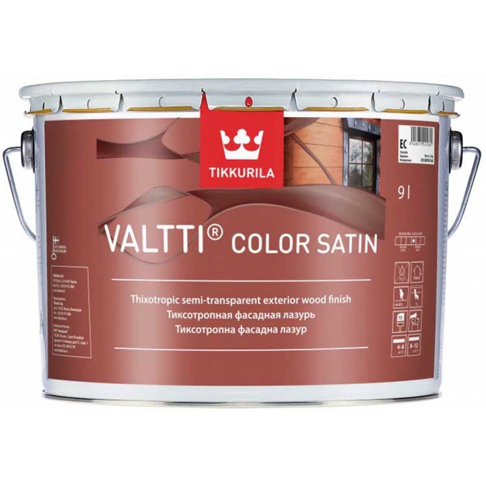 Лессирующий антисептик Valtti Color Satin Tikkurila 9л. предназначен для защиты и обработки строганых, пиленых и бревенчатых поверхностей из древесины, любого типа деревянных плит и для пропитанного под давлением дерева снаружи помещений.